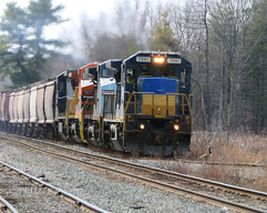 Feathery Trespasser on The Loop Part of the day's loaded grain train slowly enters "the loop" at Ayer MA. Two geese took their sweet time getting out of their way. It was a very close thing!