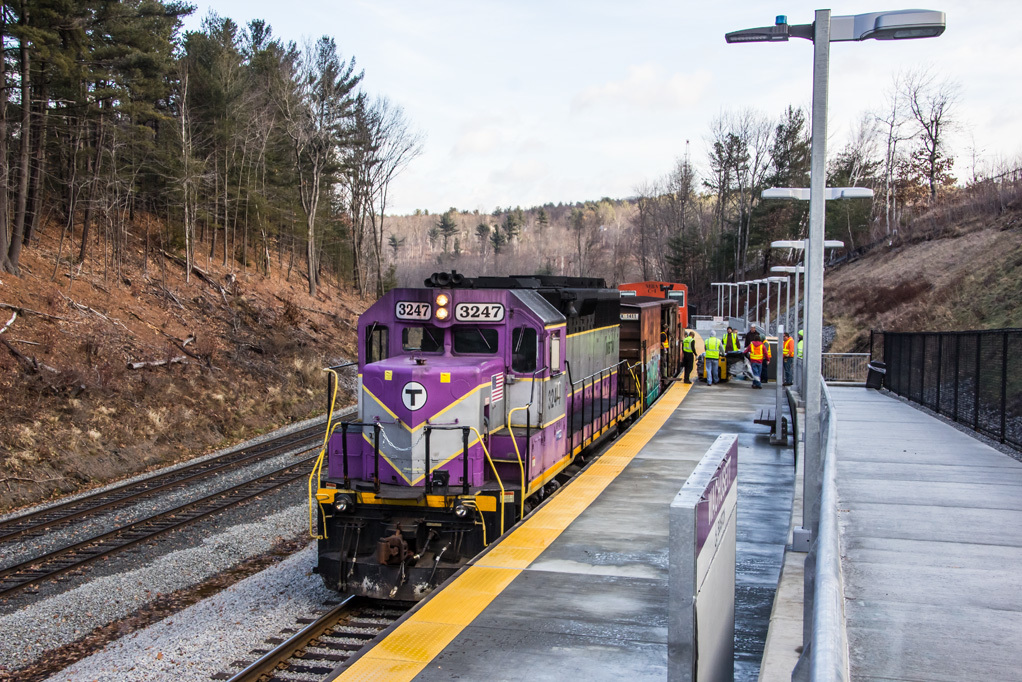 Station WorkKeolis track gang wraps up the unloading of rock salt at Wauchusett station so that the work train can "get in the clear" for a westbound passenger train.