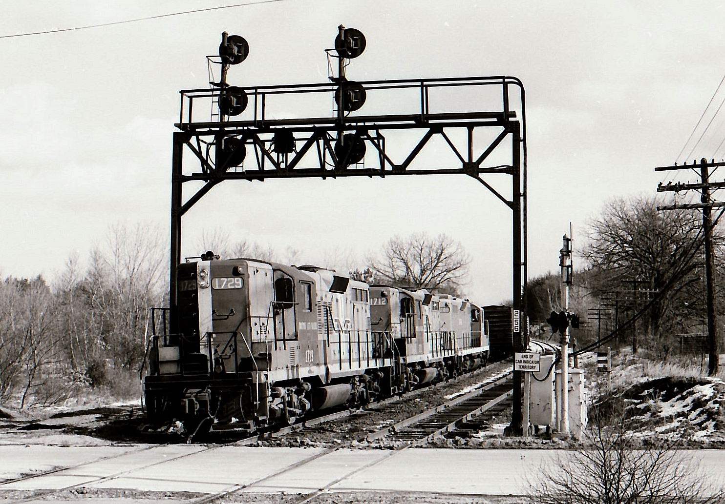 Ayer, MAWestbound with BM 1729, 1712, 1741 GP-9's has "head pinned" it's power at Willows Interlocking, leaving it's train on the Stony Brook.Note sign "End of Cab Indicator Territory". Cab Indicator (cab signal) was still in effect between Ayer and Boston on the Fitchburg Route.