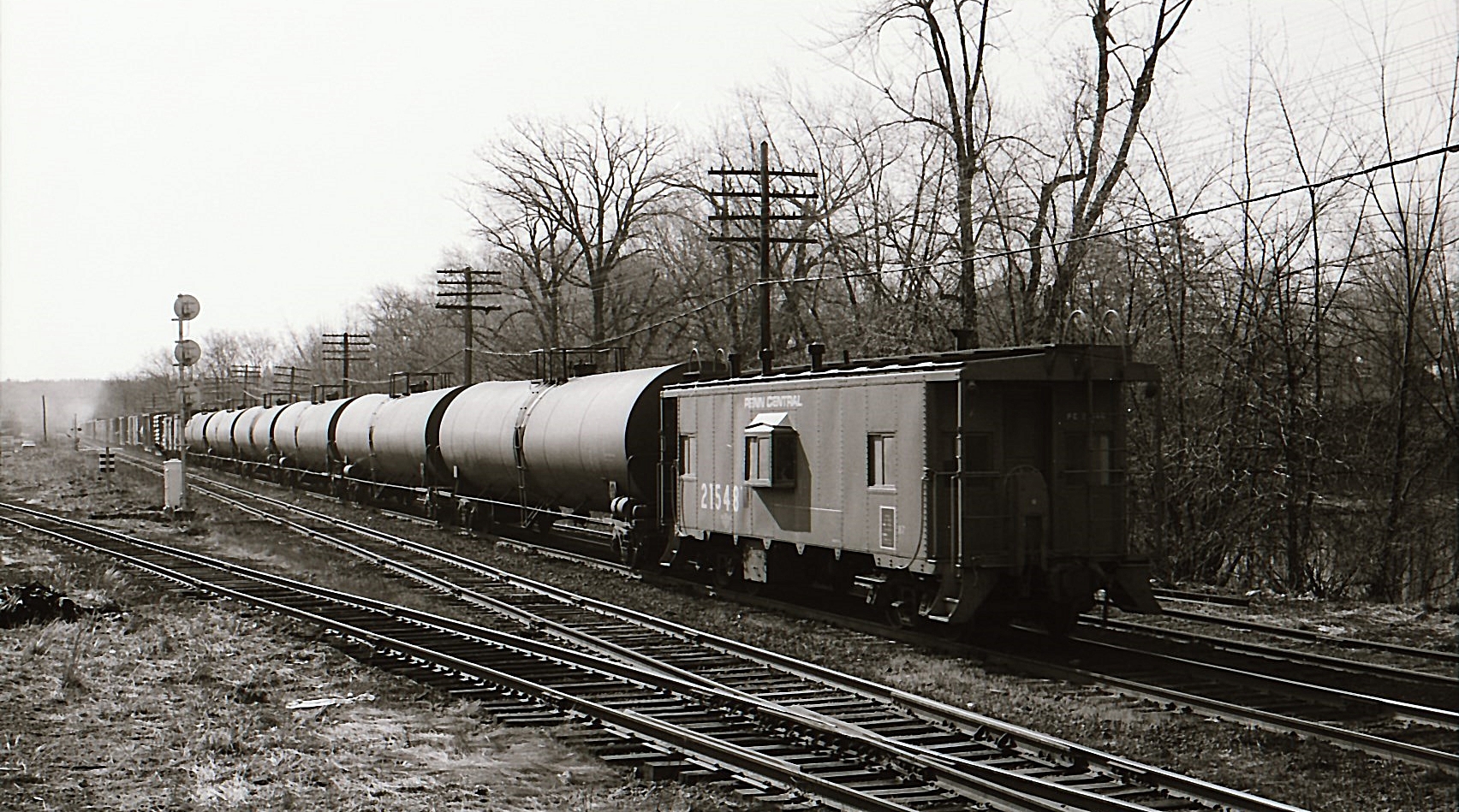Ayer, MAEastbound East Deerfield to Boston job passing through Ayer Interlocking. Six tank cars ahead of caboose are empty Hartwell Oil cars that were in Revere to Mt Tom service back when Mt Tom Power Plant burned oil. B&M crews loved PC cabooses especially the ex NYC bay window models. This is back in the day when PC had trouble keeping track of their cabooses.