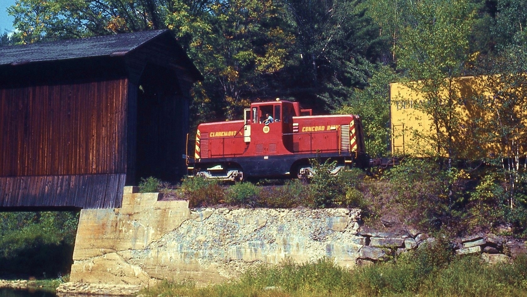 Westbound.Returning from Newport, the Long freight is about to cross the Sugar River. It will continue south of the river until it crosses the next covered bridge.