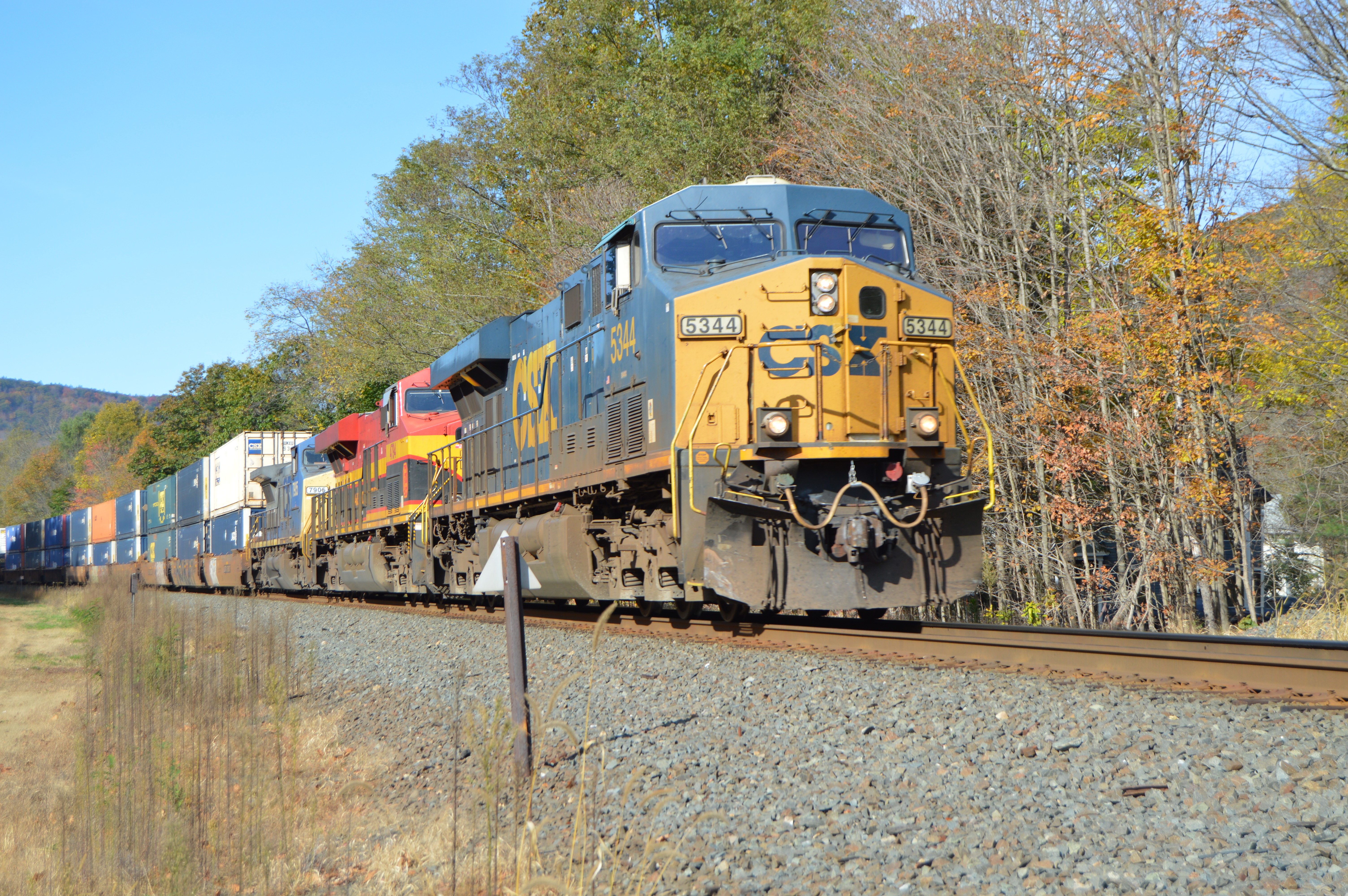 Eastbound at Huntington No. 1The morning of October 22, 2017, in glorious foliage, with a colorful treat! (see next photo)