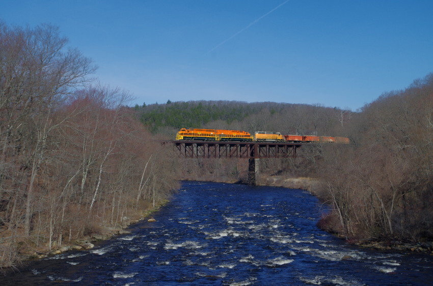 New England Central @ Millers Falls, Ma. NEC crosses the Millers. Photographed by Bruce Macdonald, April 18, 2025. Added to the photo archive by Bruce Macdonald, April 18, 2025. Railroad: New England Central. | Bruce Macdonald's awards: |        |