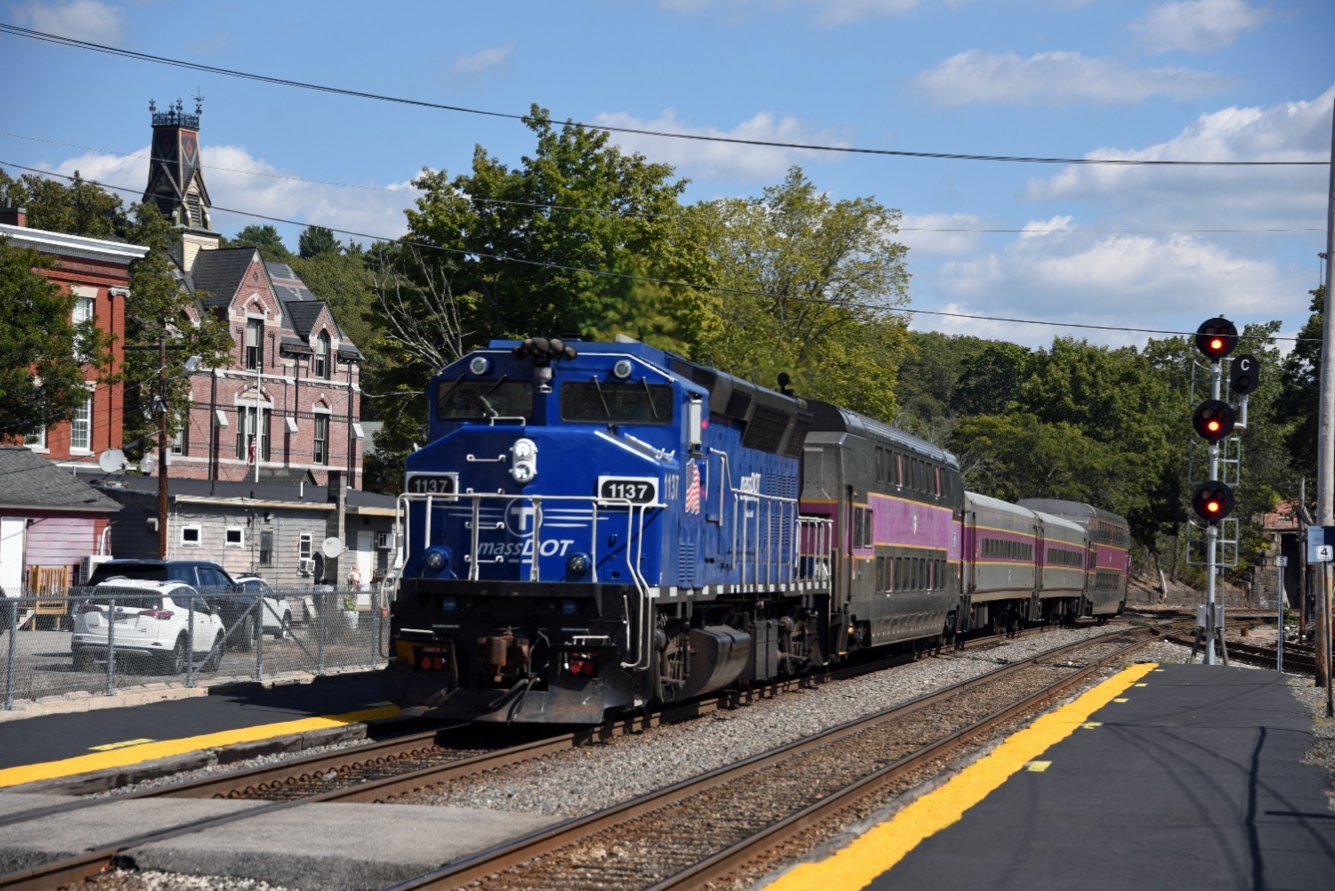 MassDOT OutboundMassDOT 1137 arrives Ayer, MA station with an outbound commuter.
