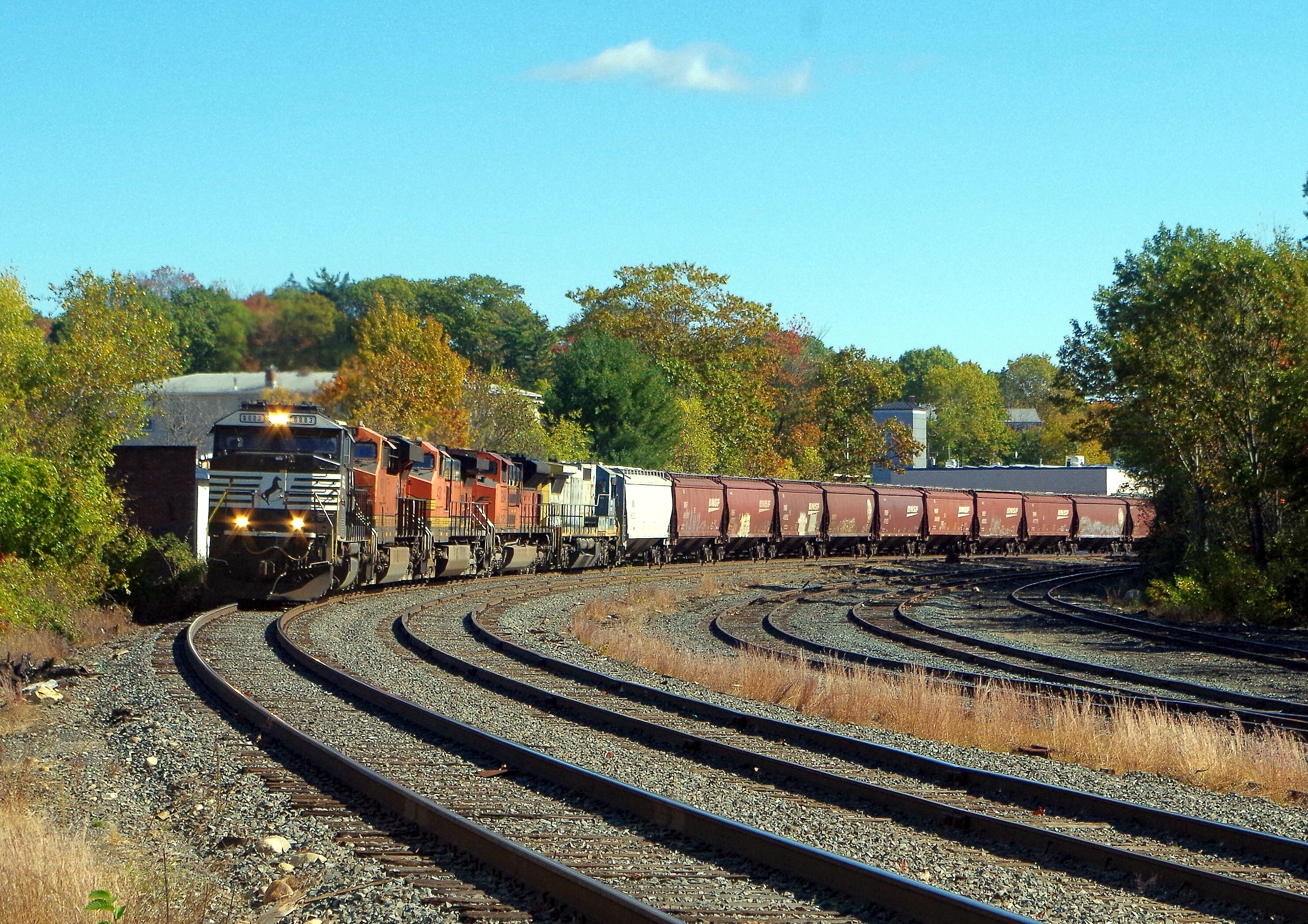 Norfolk Southern + BNSF @ Gardner, Ma. The empty Grain Train pulls thru the "S" curve as it makes its departure. Photographed by Bruce Macdonald, October 17, 2025. Added to the photo archive by Bruce Macdonald, October 19, 2025. Railroad: Pan Am Southern. | Bruce Macdonald's awards: |        |