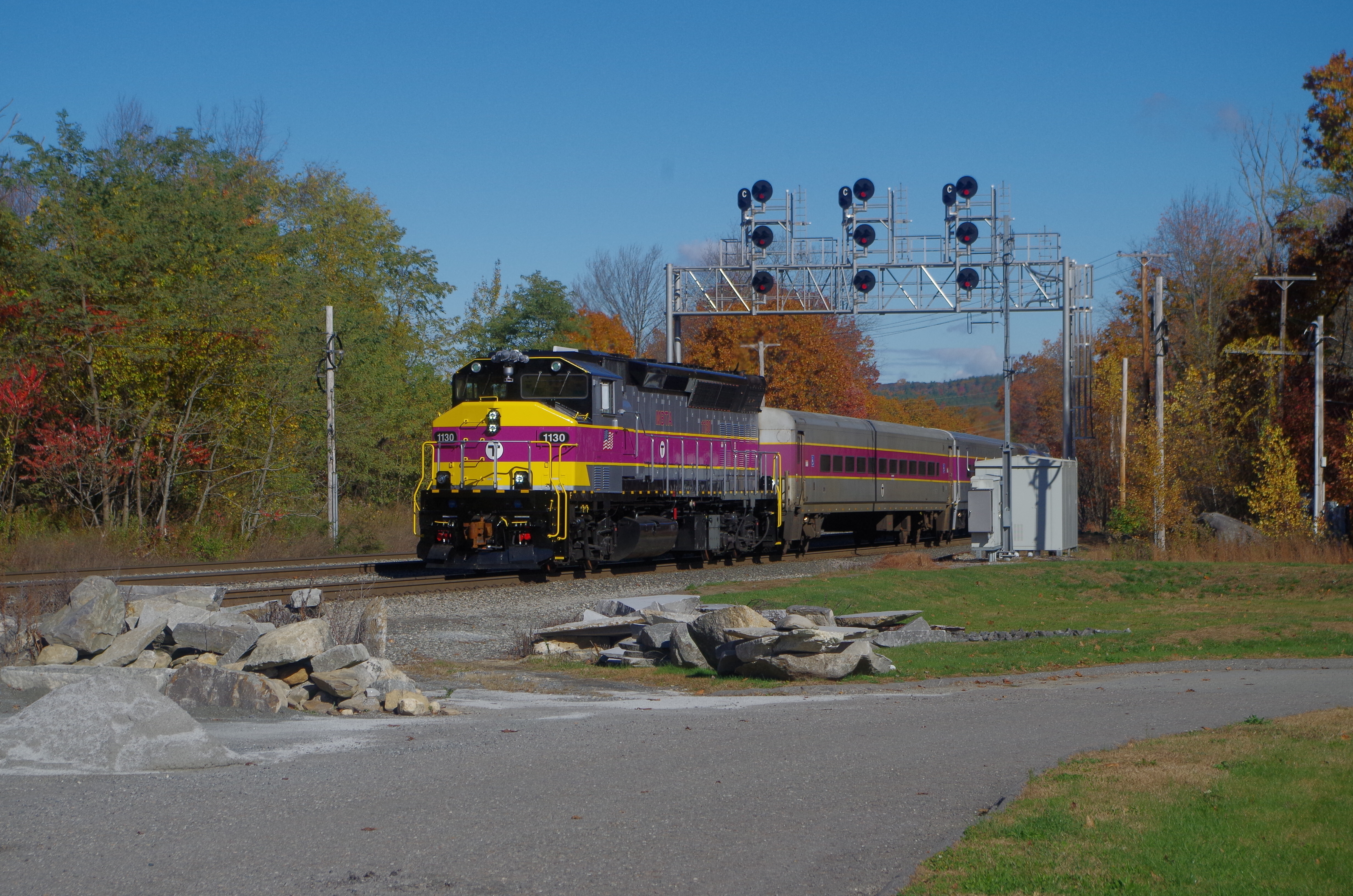 The Fall Special slips past the Wachusett signal tower as it arrives at the T-station.