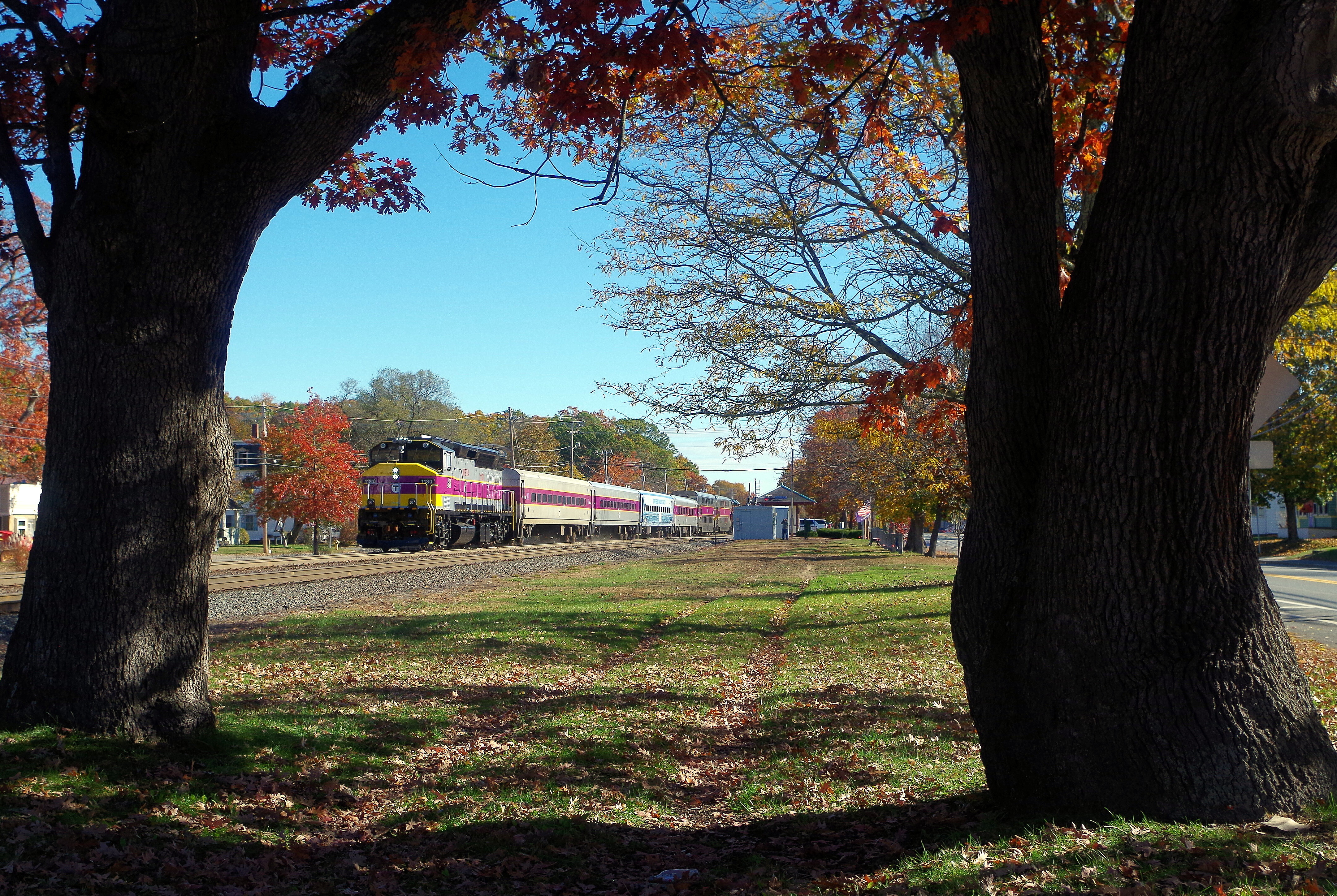 MBTA @ Shirley, Ma. The Fall Special, running late, accelerates past the T-stop. Photographed by Bruce Macdonald, October 25, 2025. Added to the photo archive by Bruce Macdonald, October 25, 2025. Railroad: Pan Am Southern. | Bruce Macdonald's awards: |        |