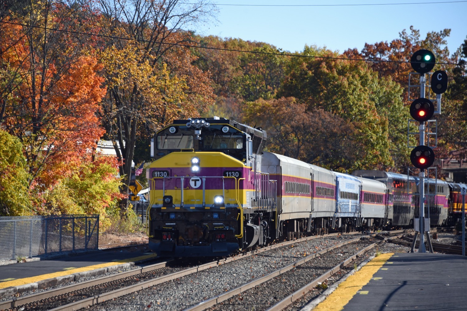 Got Lucky AgainI didn't even know this Fall Foliage Special to Wachusett was running today, but here they are with the new MBTA "Easter Egg" heritage unit at track speed through Ayer, MA station.