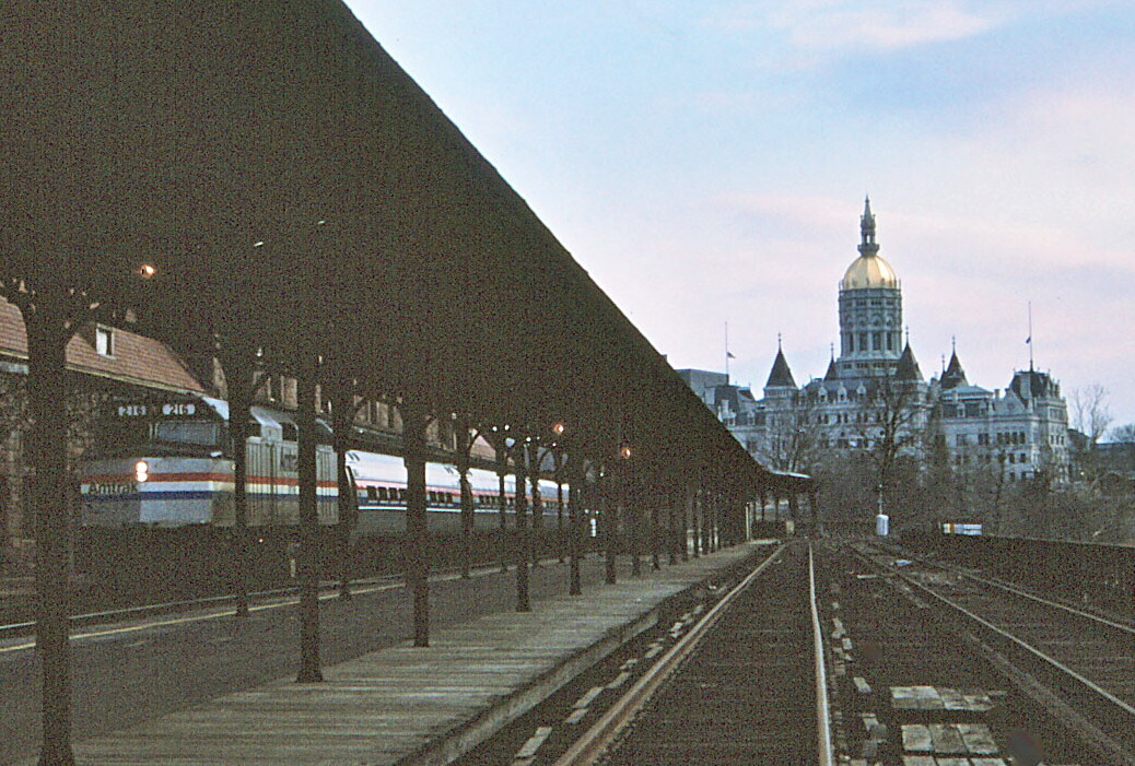 Amtrak @ Hartford, Ct. A view of the Capital building from the station. Photographed by Bruce Macdonald, April, 1986. Added to the photo archive by Bruce Macdonald, October 27, 2025. Railroad: Amtrak. | Bruce Macdonald's awards: |        |