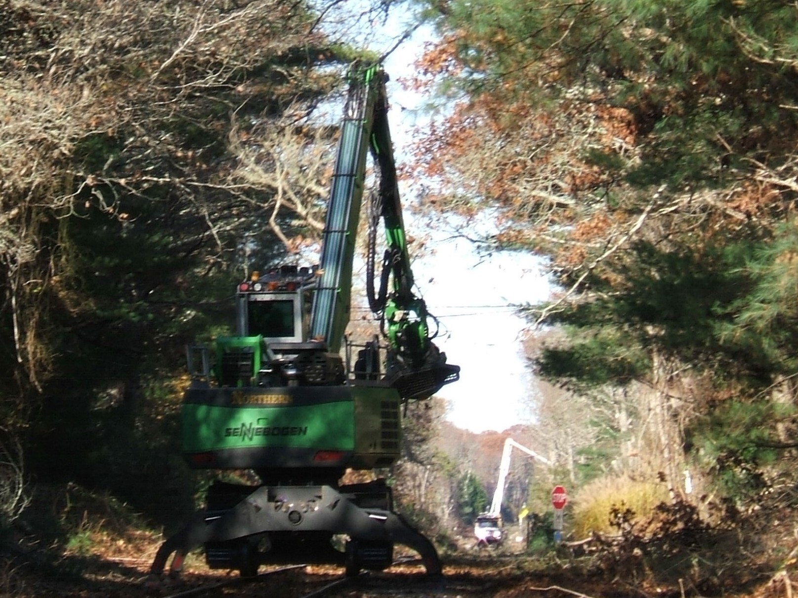 Northern Tree Service on the Falmouth Secondary lineTree cutting by Northern's green monster and bucket truck in the distance taking care of business near the Monument Beach MA crossing. Paused for a short time today to allow Mass Coastal RR to deliver / pick up C/D cars at the Otis transfer station