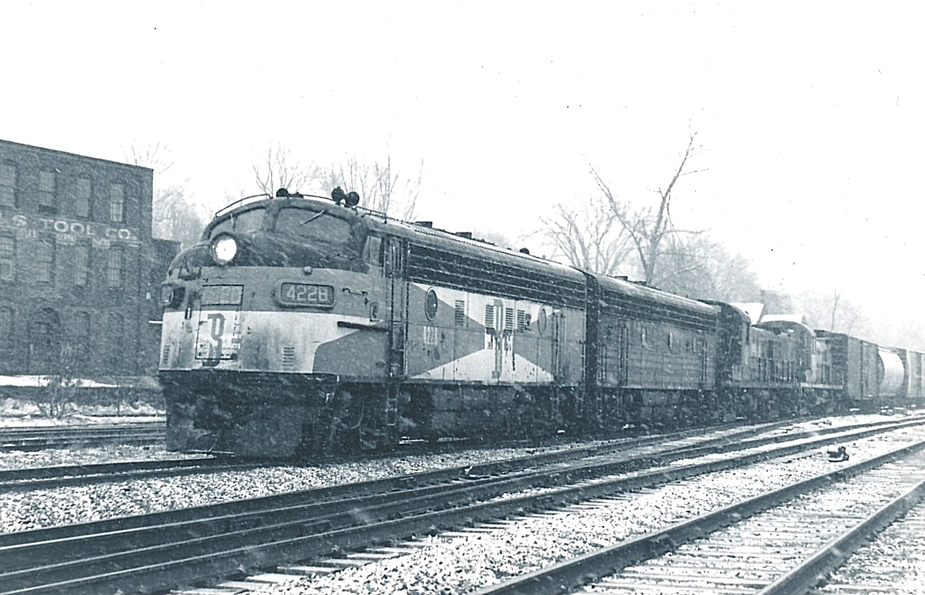 GREENFIELD, MA Northbound typical Conn River power consist; BM 4228 F-3a, 4227 F-3b, 1515 RS-3, 1542 RS-3. Photographed by Bruce Nelson, March, 1970. Added to the photo archive by Bruce Nelson, December 29, 2025. Railroad: Boston & Maine. » Contact the person who posted this photograph.