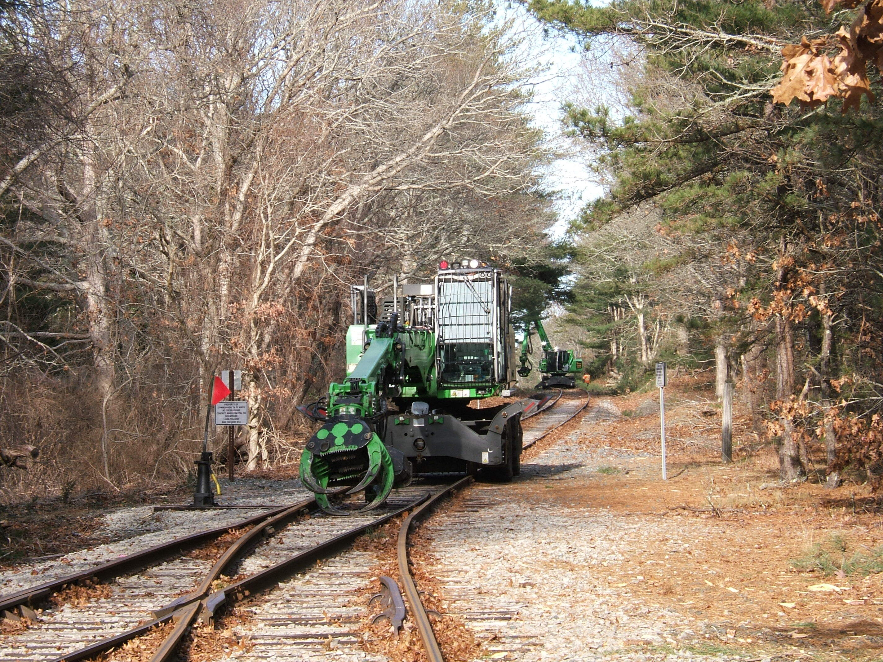 Paused at the siding switchTree cutter paused at the North Falmouth MA siding switch at MP 6.50 on the Falmouth Secondary line today. Going for the home stretch to completion, as the cutting contract stops at County Rd RR crossing at MP 6.80
