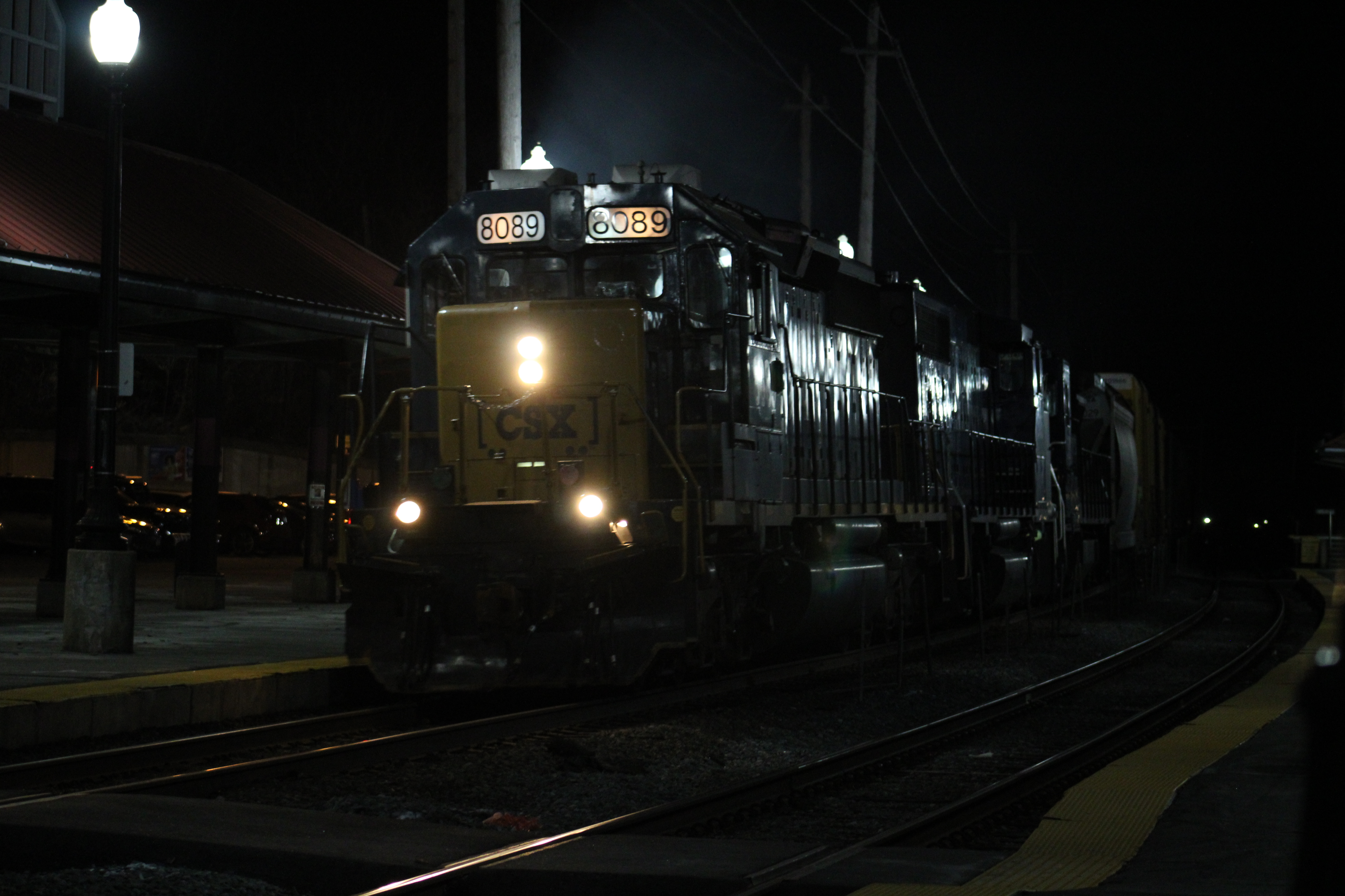 Westbound L080-13Charges west thru Haverhill MA station on track 2 with CSXT 8089-MEC 505-MEC 5958 & 23 cars. The 5958 & 23 cars would get dropped at Lawrence yard.