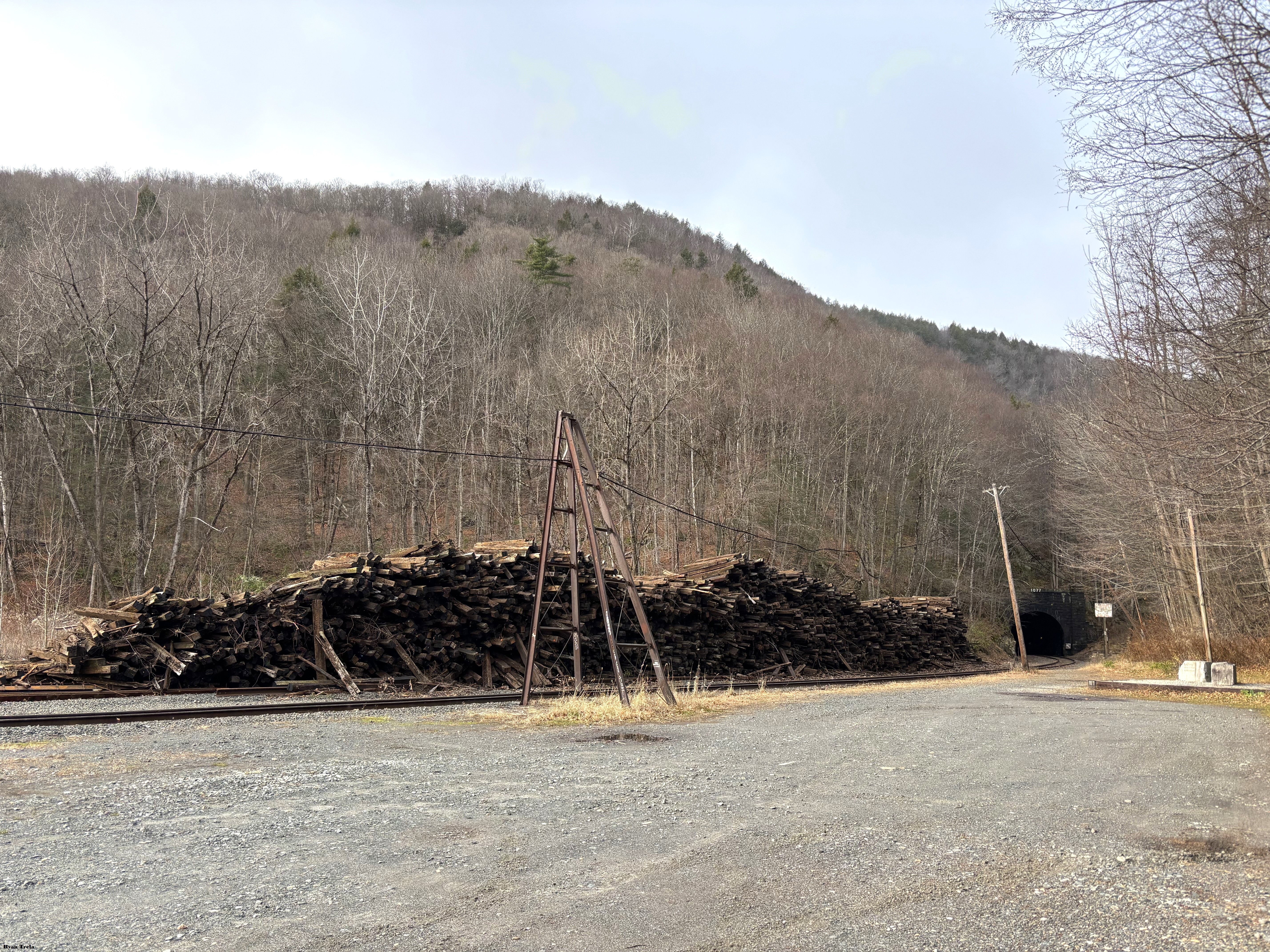Massive pile of tiesDuring a visit earlier in November I noticed the pile of ties that had been sitting at the eastern tunnel entrance of the Hoosac tunnel was starting to be removed. Later that month I came back to this massive pile. It seems they've been removing all the old piles of ties along the west to east. They brought here via high-rail truck then loaded them up on another truck and hauled out.
