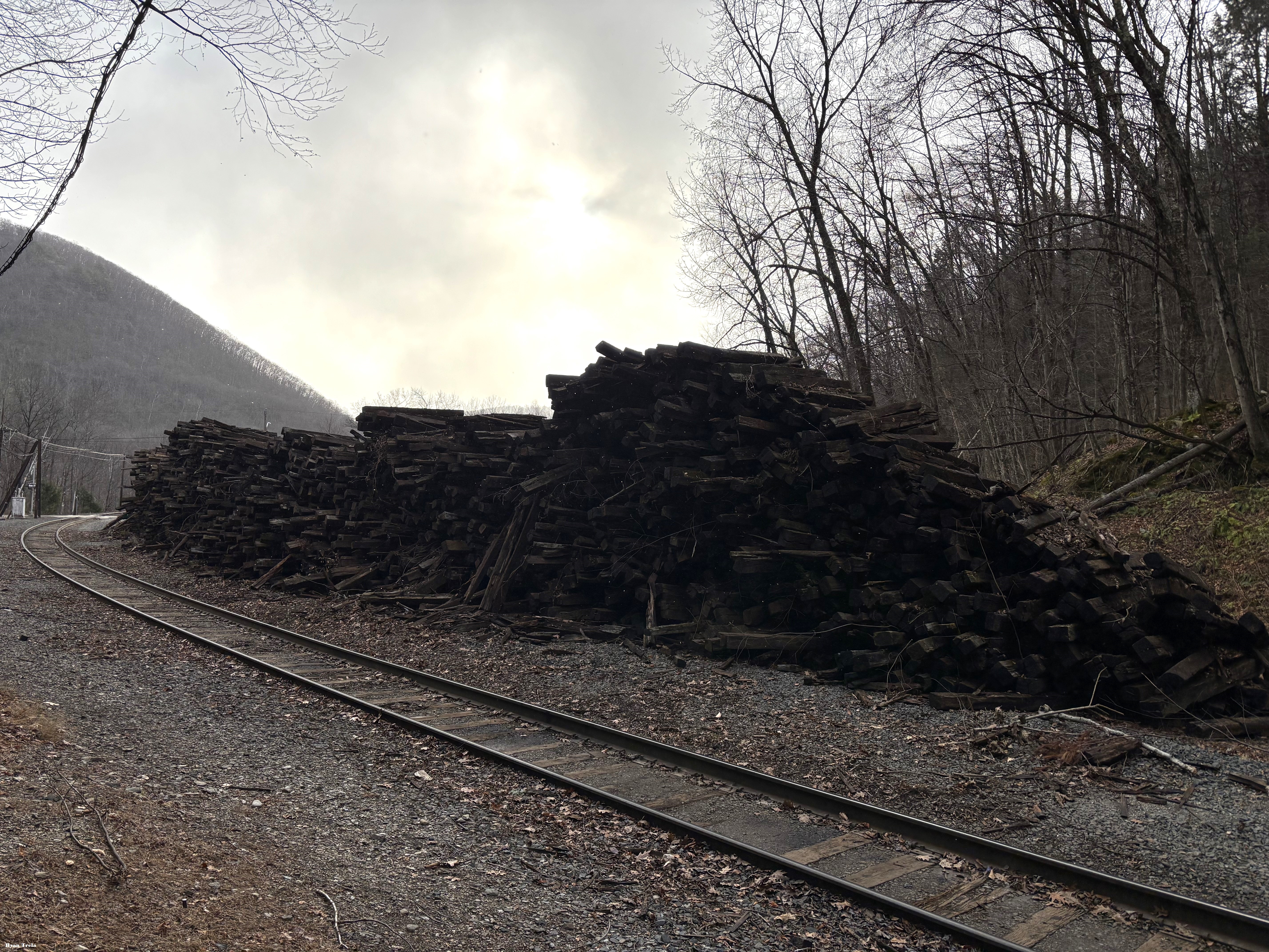 During a visit earlier in November I noticed the pile of ties that had been sitting at the eastern tunnel entrance of the Hoosac tunnel was starting to be removed. Later that month I came back to this massive pile. It seems they've been removing all the old piles of ties along the west to east. They brought here via high-rail truck then loaded them up on another truck and hauled out.