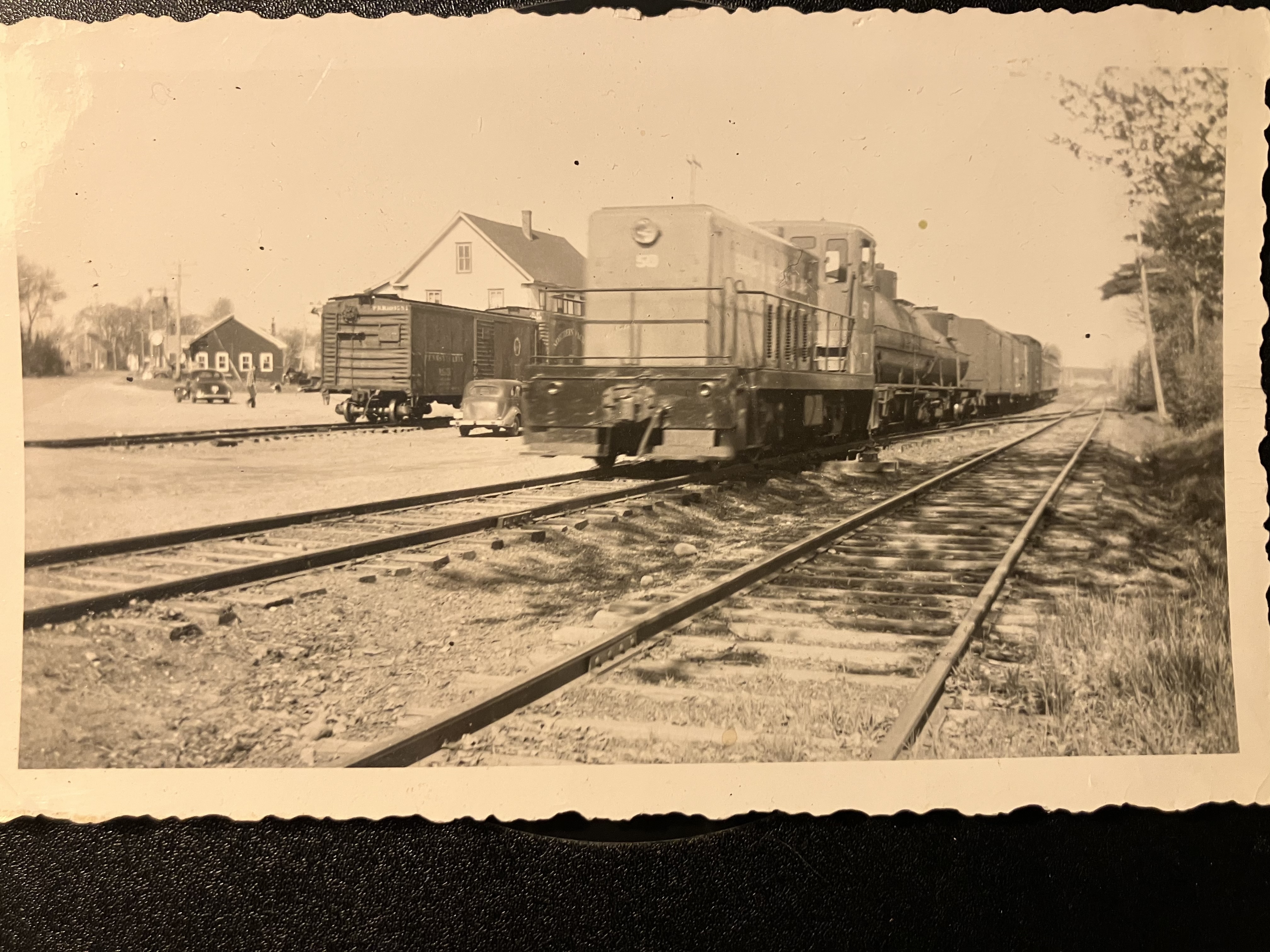 Somewhere in MaineHere’s an old photo I recently purchased, with my best guesses about it: BML 50 heading a mixed train southbound through Unity, ME in the late 1940s. I think the Depot is out of sight behind the locomotive. I think the last car of the train is a coach or combine. The engine is a GE 70-tonner that the railroad bought new in 1946. I think it’s at Unity based on the angle of the road, and the number of tracks. I’d put the time of day pretty close to noon based on the shadows. Feel free to chime in if you have any other ideas!