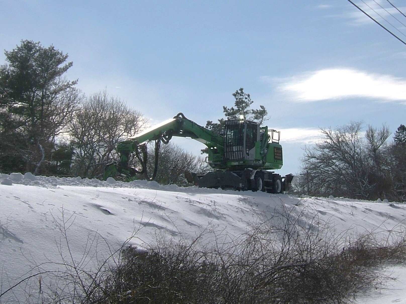 Clearing the Cape Main Northern styleNorthern Tree Services at work with a log in its gripper sliding it along on top of the rails to clear off the snow on the Cape Main line. Photo was at Aptucxet trading post area at MP 55.43