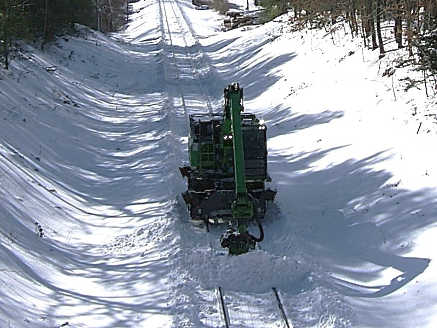 Clearing the Cape Main Northern styleNorthern Tree Services approaching the Perry Ave overhead bridge MP55.73 in Bourne MA on the Cape Main. Was using a log in its gripper to slide along on top of the rails like a snowplow to clear out their work areas.