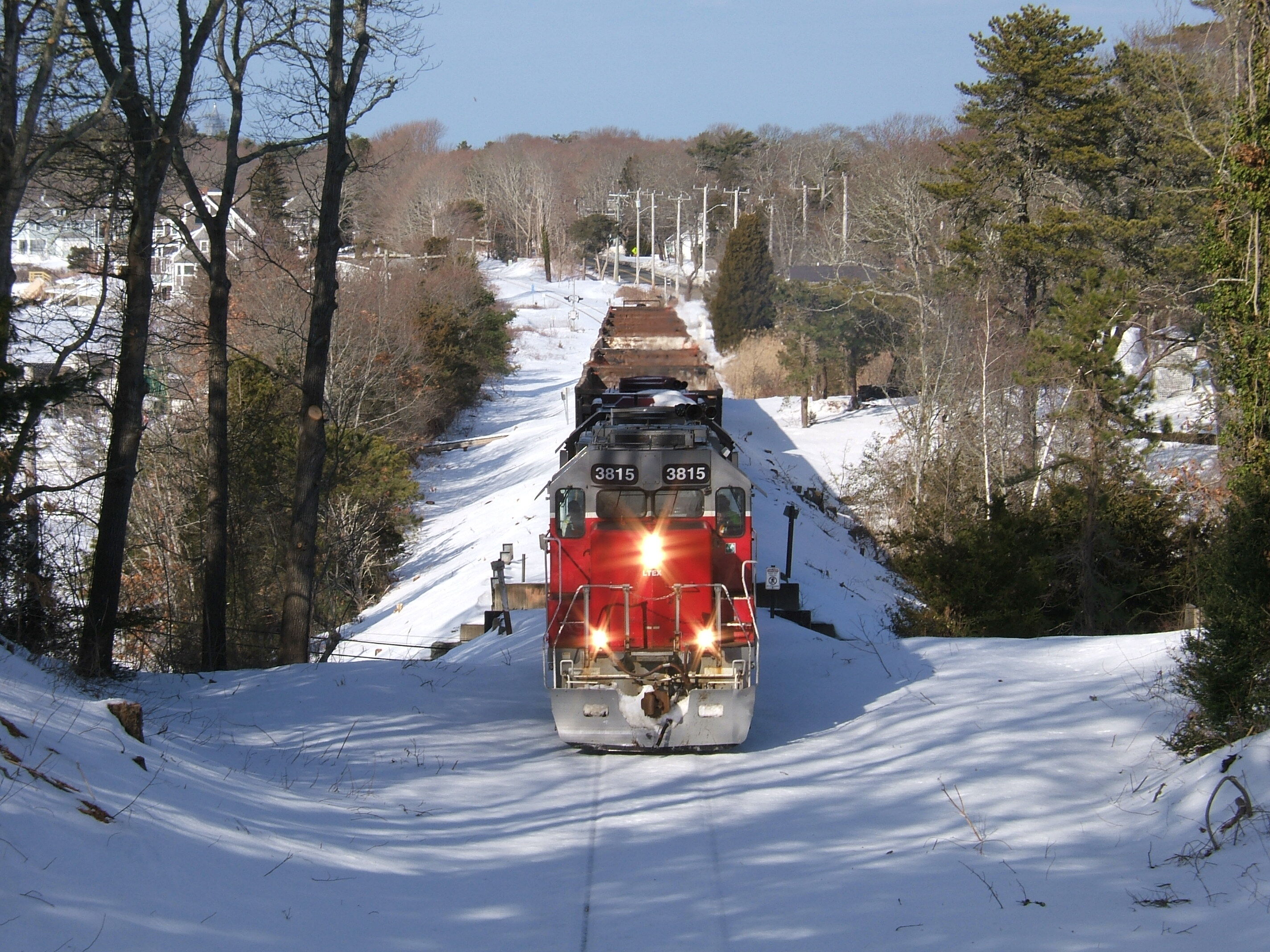 LTEX 3815 / MC 2012 on the Falmouth Secondary lineLTEX 3815 / MC 2012 with 7 empty C/D cars and 1 tank car on the end which was picked up earlier from the Canal power plant. Was headed South bound out to Otis to pick up full C/D loads with the empty tank car to be on the end for the Off Cape trip. Photo taken from the Briarwood bridge in Monument Beach MA and the recently cleared out ROW certainly opens the picture up.