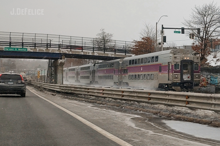 MBTA and the Mass PikeQuick cell-pic of inbound MBTA commuter under Havard St in Newton MA, on the old Boston & Albany/New Haven. The Mass Pike was partly built on the original ROW.