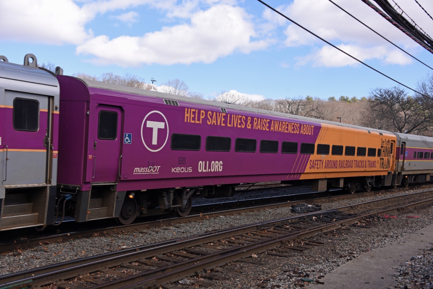 MBTA coach 649 with a safety awareness message.