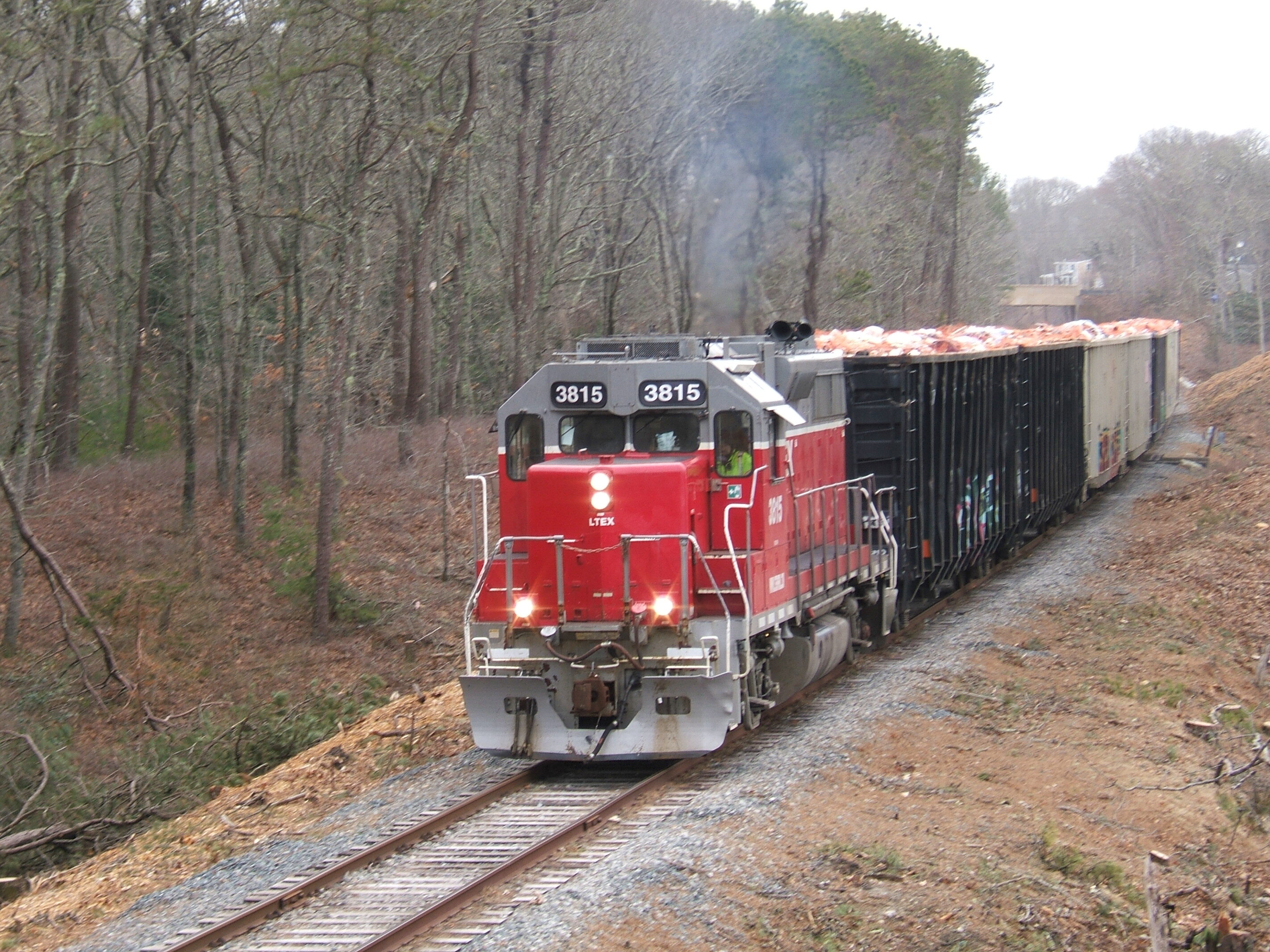 Mass Coastal LTEX 3815Mass Coastal LTEX 3815 northbound on the Falmouth Secondary line with 9 full cars of C/D headed off Cape. Photo taken in the Monks Park area at MP 2.86